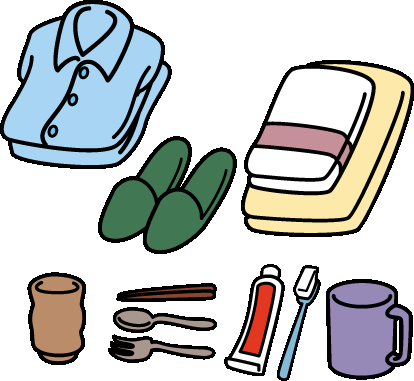 @衣類、タオル等には必ずお名前を記入下さい。 A服装は運動しやすい服装にして下さい。 B履物は運動しやすい靴にして下さい。 C入浴の方はバスタオル1〜2枚、タオル1枚、 着替え等をご持参下さい。 D箸、スプーン、コップ、歯ブラシ、おむつ (おむつの必要な方)等はご持参下さい。 |